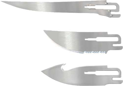 -Pack includes: 1-3" Gut Hook Combo Blade, 1-3" Partially Serrated Blade, 1-5" Fillet Blade